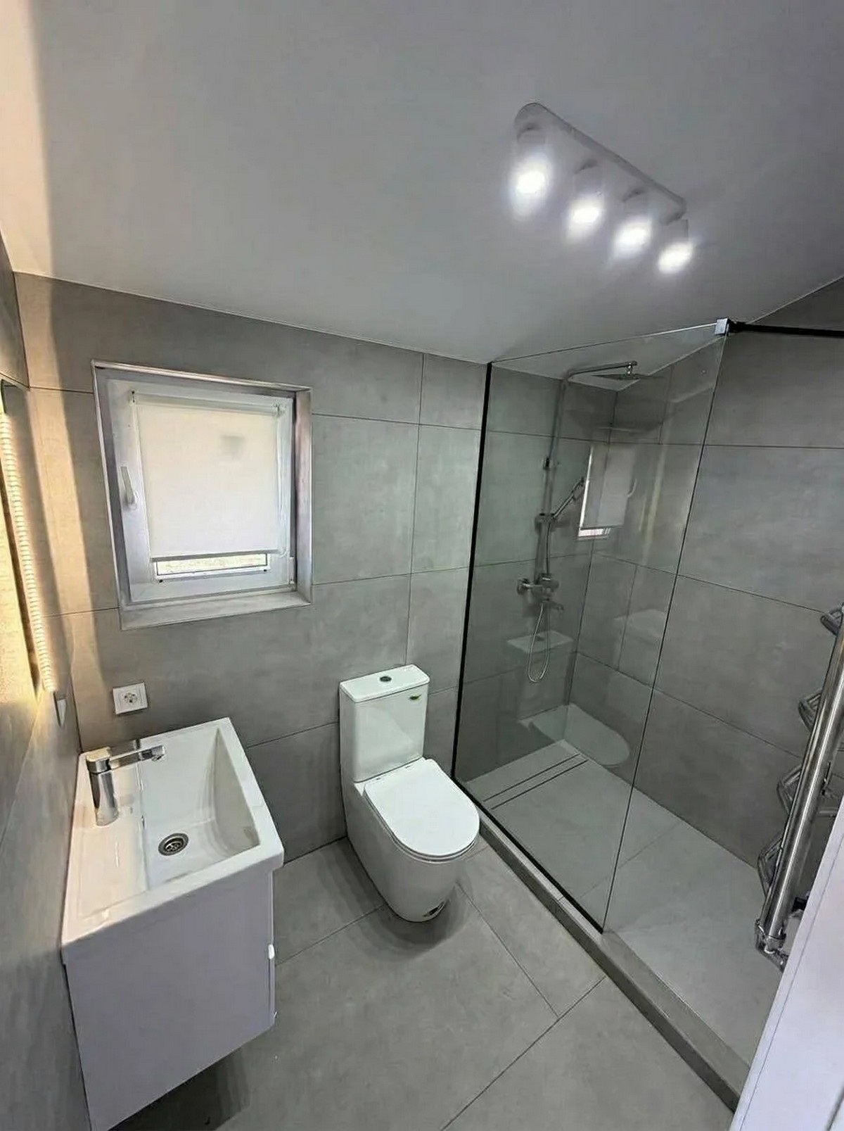 Индивидуальная ванная комната: душ, раковина, туалет.